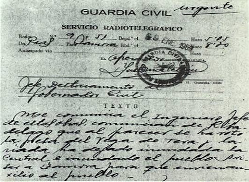 Comunicado del puesto de la Guardia Civil al Gobierno Civil de Zamora, informando de la rotura de la presa y solicitando ayuda para el pueblo (Ribadelago).